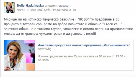 Водещата на "Търси се" Нели Хаджийска обвини доскорошната си колежка в bTV Ани Салич, че се опитва да й открадне предаването. Тя публикува остър коментар в социалната мрежа по адрес на предстоящия старт на "Извън новините" в ефира на Нова телевизия, пише Блиц.