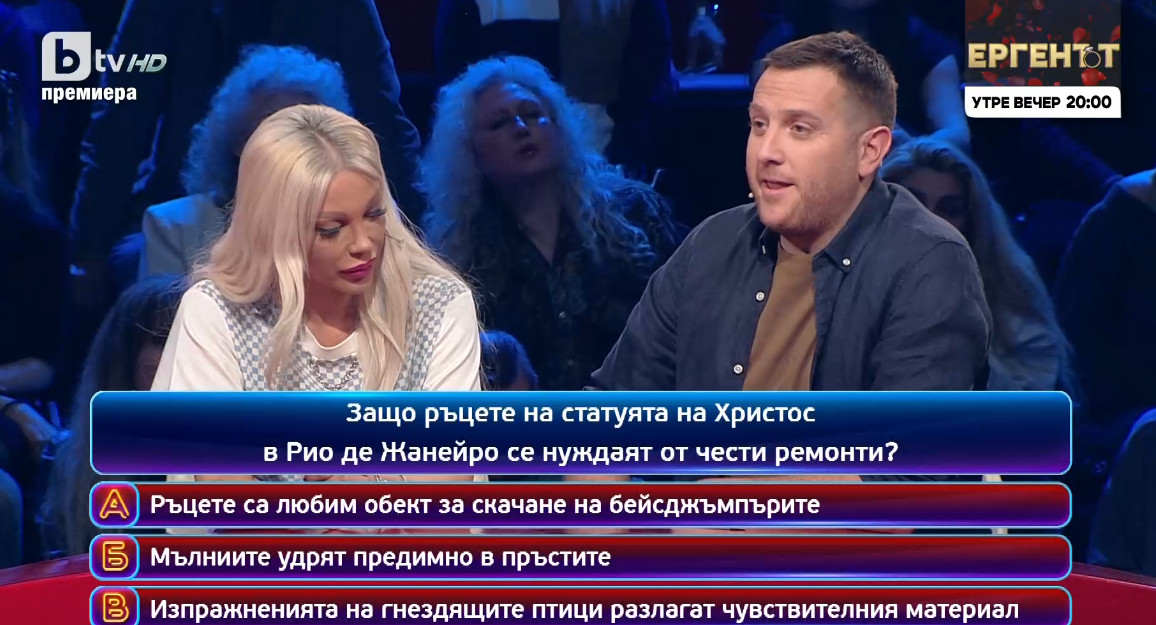 Актьорът обича да гледа популярни наши предавания и това му помогна тази вечер да отговори правилно на въпроса за 300 лева: „Защо ръцете на статуята на Христос в Рио де Жанейро се нуждаят от чести ремонти“?