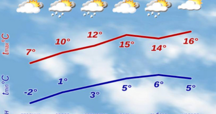 В четвъртък, петък и събота ще бъде ветровито. Ще има и валежи, на повече места и повече по количество в четвъртък и събота. Температурите ще се повишават и в събота минималните ще са между 3° и 8°, а максималните - между 13° и 18°.