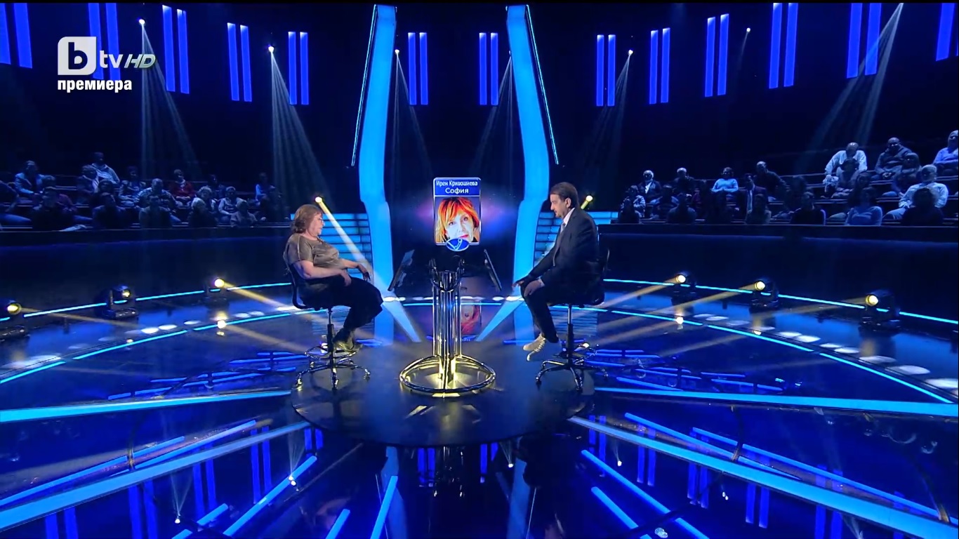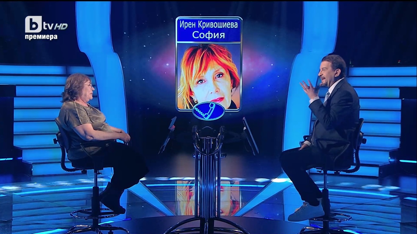 Дамата не знаеше отговора и поиска да се обади на приятел. Водещият посрещна много добре новината, че ще се чуе с 67-годишната българска актриса, която има син от Стефан Данаилов. "Звънкаме на Иренка. Тя живееше и в Америка, Холивуд, далеч от тук", каза той, след което проведе следният разговор с Кривошиева: