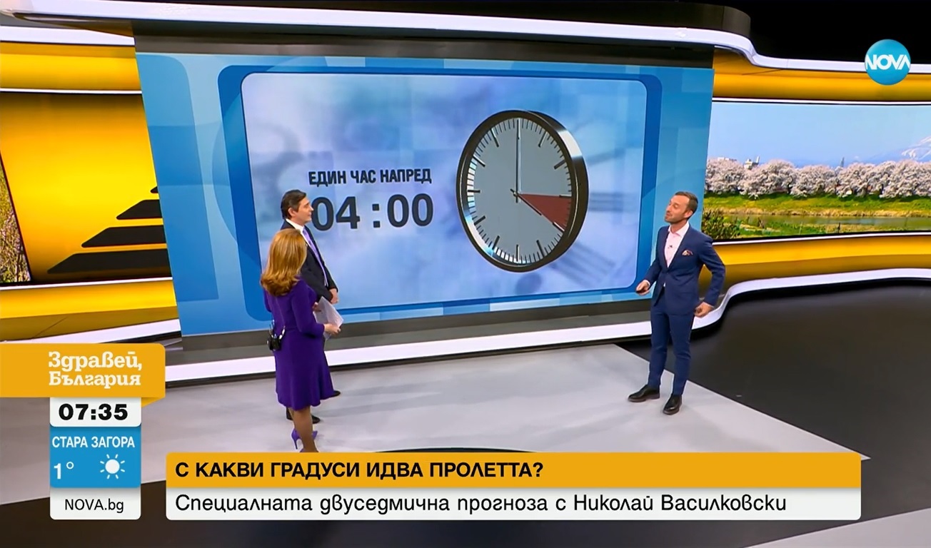 "Хващаме метлата и измитаме зимата. Тази вечер преминаваме към астрономическата пролет.. В 23,24 ч. настъпва. Очаква ни пролетно време в следващите дни, до 27 март. Температурите ще са около 20 градуса, а някъде дори до 25. По-драматични периоди са утре и вдругиден, когато преминава един Средиземноморски циклон. Валежите в него не са много значителни. Ще преминат над цялата страна - краткотрайни валежи, без захлаждане. На 28 и 29 ни очаква едно захлаждане, от което има опасност на високите места в Западна България , както и в Предбалкана да падне сняг. Застудяването ще е сутрин около нулата, а следобед до 10 градуса. Това ще е само за два дни. На 27-ми може да има гръмотевични бури и дребни градушки.