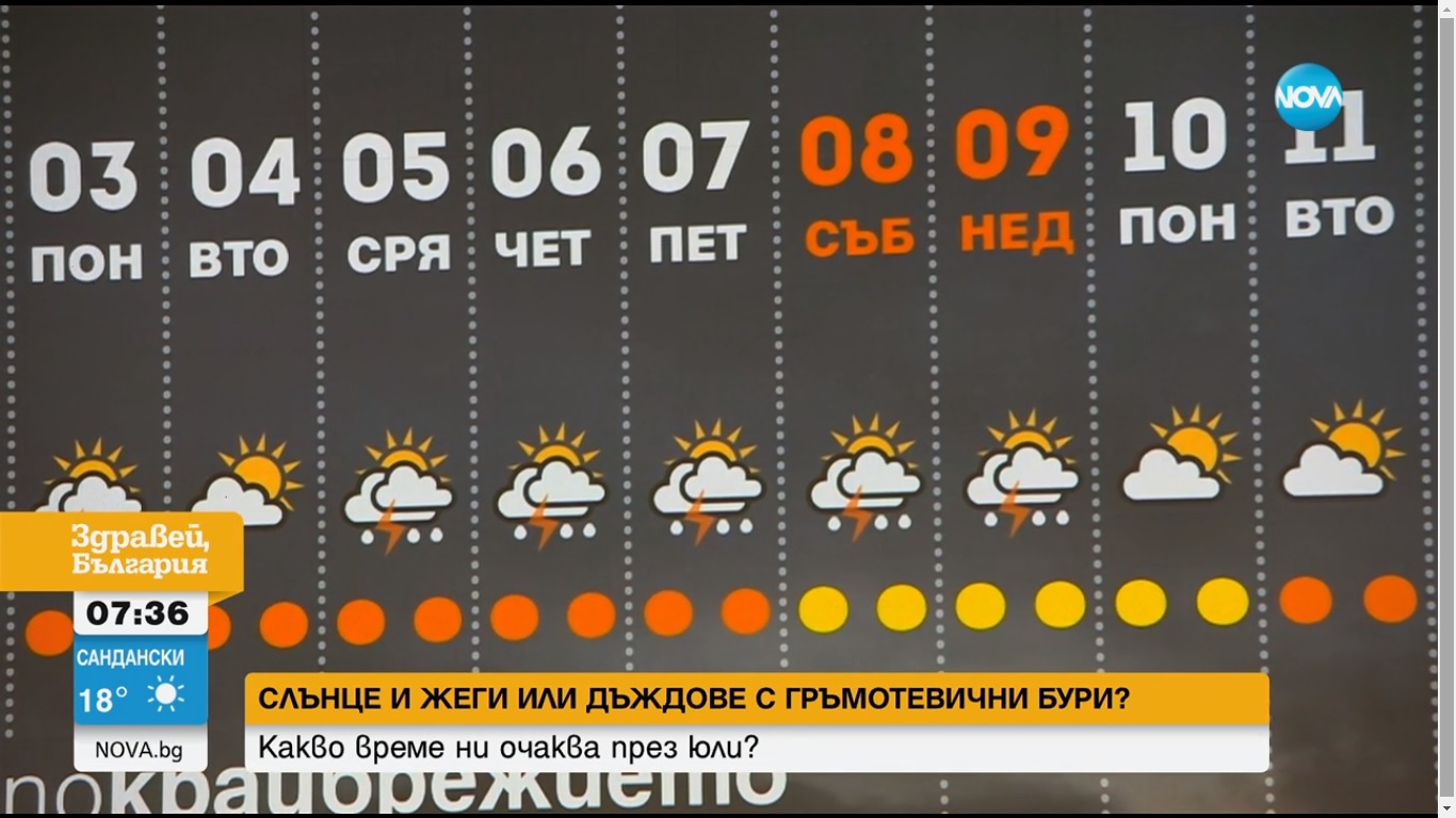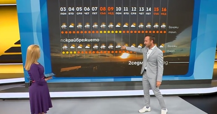 Петък, събота и неделя се очакват и там локални летни бури. По крайбрежието тези неща се развиват толкова бързо, че човек ако си е взел отпуск и е отишъл по морето почти не се усещат. Минава, превали, прегърми и пак се усмихва слънцето. Иначе като температури ще усетим някаква прохлада покрай този студен фронт на 8, 9 и 10 юли в западна и централна България. Тези части са по-уязвими на студени фронтове. По морето сега понеделник и вторник ще има леко понижение на температурите. Около средата на месеца се допускат температури до 40 градуса в традиционно най-топлите места в страната - Дунавската равнина, Сандански, Ямбол, Свиленград. По морето е много по-спокойно. Обикновено студените фронтове винаги като стигнат крайбрежието, част от тези бури се разбиват. Някъде пак превалява с гръмотевици, но на много малко места. По морето от 10-и нататък се очаква доста по-стабилно лятно време", каза той.