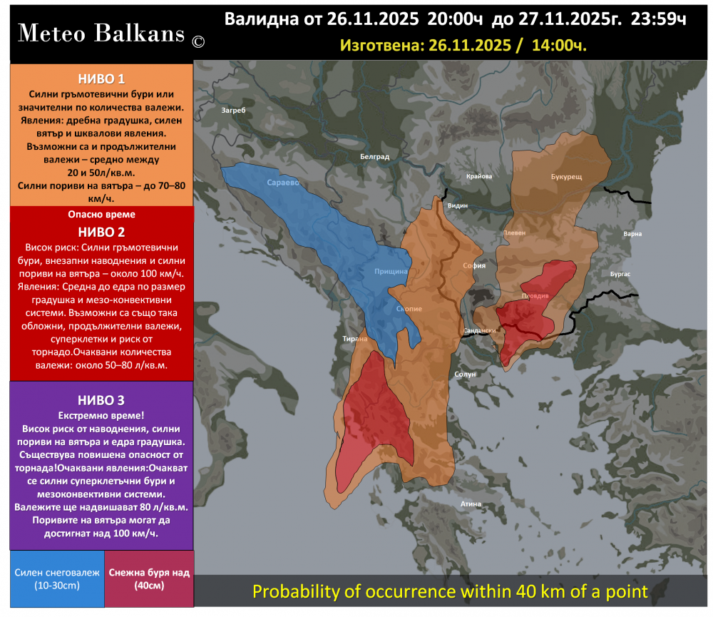 Екипът на Meteo Balkans издаде карта с предупреждения за лошо време, които са валидни за 27 ноември 2025г.