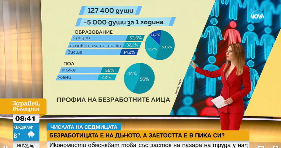 А дотогава профила на безработният българин ще продължи да изглежда ето така - мъжете са повече от жените, над половината от безработните са със средно образование, малко над 30% са тези с основно или по-ниско, а наполовината от тях са висшистите, каза още по Нова Тв Ева.