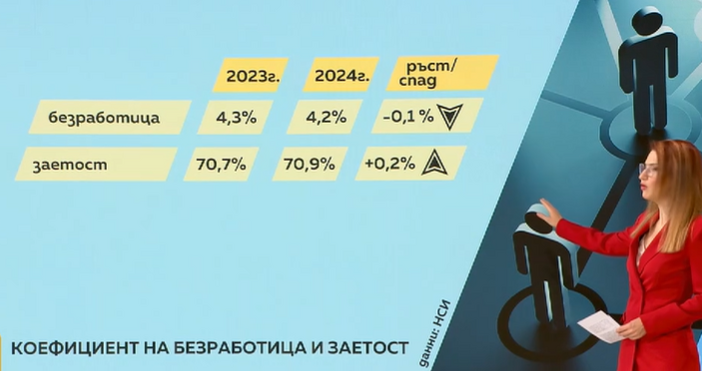 При коефициента на заетост пък, който показва какъв е делът на заетите лица от 15 до 64-годишна възраст, увеличението за същия този период отново е назначително - 0,2%.