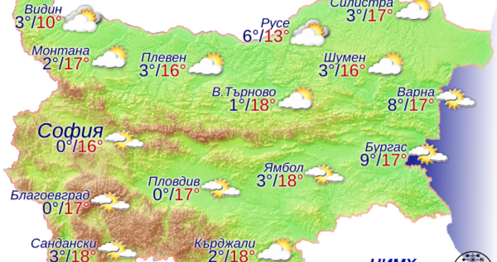 През нощта над по-голямата част от страната ще преобладава ясно време. Утре ще е предимно слънчево с временни увеличения на високата облачност. Преди обяд в Дунавската равнина и по долините на реките в Южна България ще е мъгливо. Ще е почти тихо, а през деня за кратко ще духа слаб вятър от запад-северозапад. Минималните температури ще бъдат между 0° и 5°, а максималните - между 14° и 19°, по-ниски в местата с трайна мъгла - между 10° и 13°. В София минималната температури ще е около 0°, максималната – около 16°.