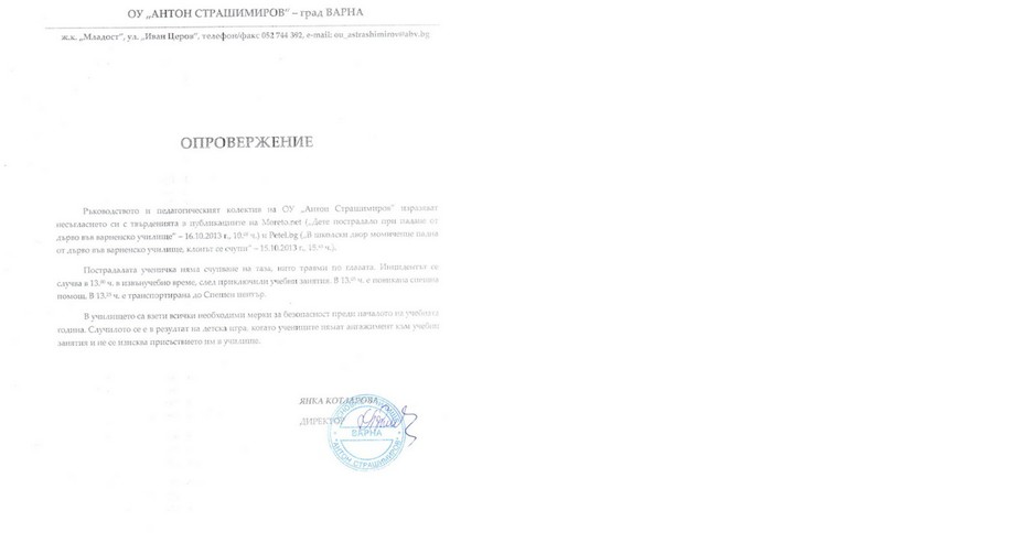 Ръководството и педагогическият колектив на ОУ „Антон Страшимиров“ изразяват несъгласието си с твърденията в публикацията В школски двор момиченце падна от дърво във варненско училище, клонът се счупил