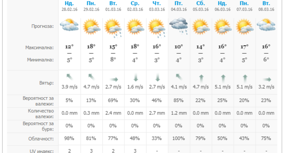 Днес ни очаква облачна, но топла неделя - време идеално за разходки.Максималните температури ще са предимно между 12° и 17°, по морския бряг – малко по-ниски, съобщи дежурният синоптик Анна Дякова от Националния институт по метеорология и хидрология (НИМХ) към БАН.