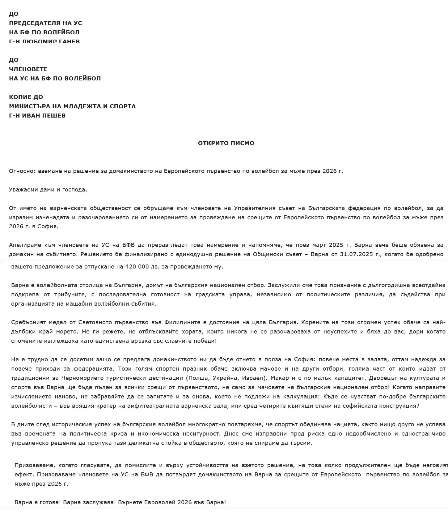 Община Варна излиза с открито писмо до Управителния съвет на Българската федерация по волейбол и нейния президент Любомир Ганев с апел да преразгледа намерението си да предостави домакинството на Европейското първенство по волейбол за мъже през 2026 г. на София. В него се настоява БФВ да потвърди провеждането на срещите в Двореца на културата и спорта във Варна, каквото беше досегашното решение. Аргументите в полза на домакинството на Варна бяха изложени от изпълняващия функциите кмет Павел Попов по време на заседанието на Постоянната комисия „Младежки дейности и спорт“ към Общинския съвет.