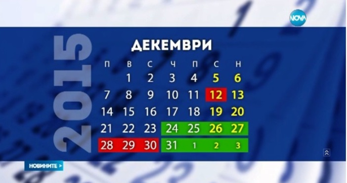 Дълга ваканция за Коледа и Нова година. По четири почивни дни ще имаме за двата празника, тъй като се сливат със събота и неделя. Работни ще бъдат само 28, 29 и 30 декември, съобщи Нова телевизия.