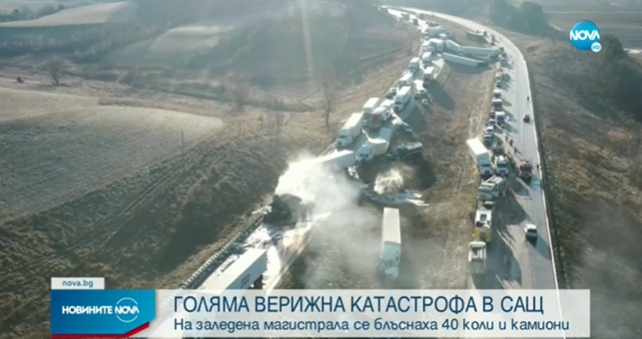 Огромна верижна катастрофа в САЩ обърка плановете на хиляди пътуващи. Причината - заледен асфалт. Повече от 20 тира са се блъснали, като някои разсипали товара си на магистралата. Две коли са се запалили и изгорели напълно. Според полицията няма сериозно пострадали, предаде Нова тв.