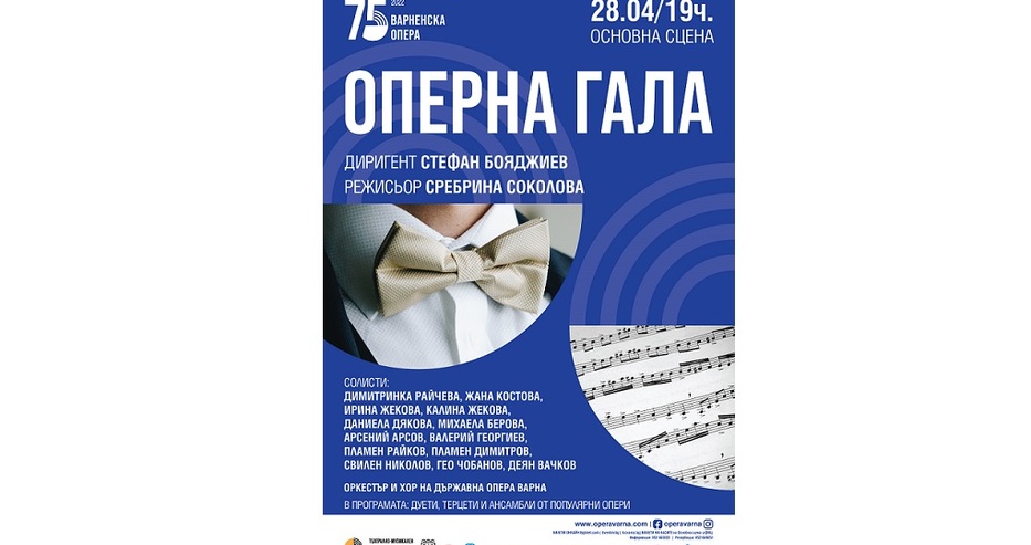 ОПЕРНА ГАЛА с диригент Стефан Бояджиев, режисьор Сребрина Соколова, оперни и балетни солисти, хор и оркестър на Държавна опера Варна. СПЕЦИАЛЕН ГОСТ ОКСАНА ТЕРЕЩЕНКО ОТ НАЦИОНАЛНАТА ОПЕРА НА УКРАЙНА