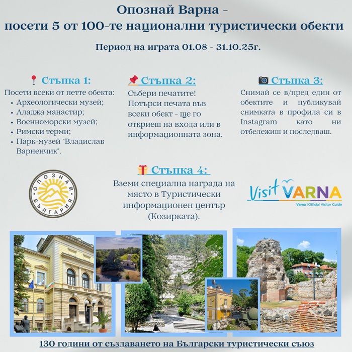 Официалният туристически сайт на общината VISIT.Varna.bg провежда игра, насърчаваща жители и гости на града да посетят петте обекта в града, включени в националната инициатива „Опознай България“. Всеки, който събере печати от всички обекти в периода от 1 август до 31 октомври 2025 г. и сподели снимки от посещенията си в личния си профил във Facebook или Instagram, ще получи награда на място в Туристическия информационен център (Козирката), пл. „Св. Св. Кирил и Методий“.