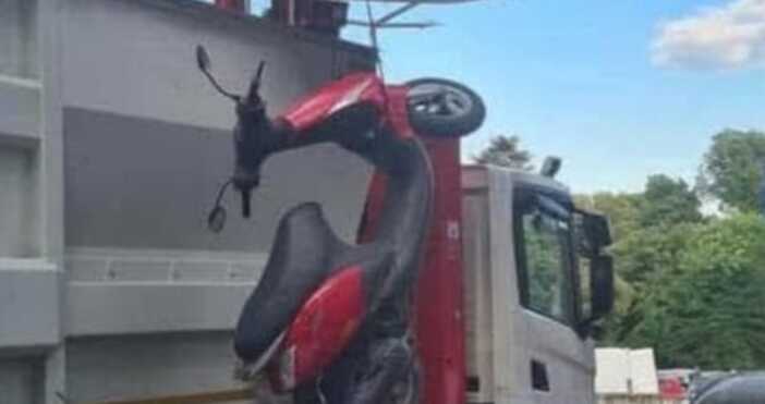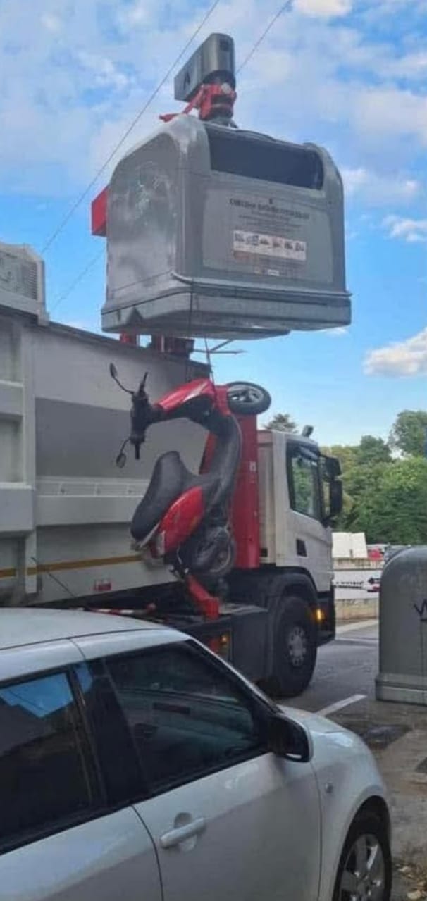 Гражданка показа смайващ кадър в социалната мрежа, на който се вижда как скутер виси, закачен на контейнер за боклук в момента, в който камионът го вдига.