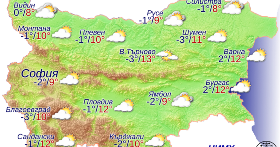 През нощта вятърът ще стихне и отново на много места в равнините ще се образува мъгла или ниска слоеста облачност. Над планинските райони ще преобладава ясно време. Минималните температури ще бъдат между минус 4° и 1°, малко по-високи по Черноморието, в София – около минус 2°. Утре през по-голямата част от деня в равнините и котловините ще се задържи облачно и мъгливо, а над планинските райони ще е предимно слънчево. Към края на деня ще се появи и усили вятърът от североизток. Максималните температури ще бъдат между 8° и 13°, в София – около 9°.