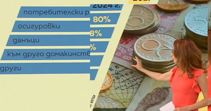 Въпреки това то все още е най-голямото – 80 процента от това, което изкарваме, отива в тази посока. Следват осигуровките, за които отделяме осем процента, след тях са данъците, които ни струват 5 процента, и накрая има едно много малко перо, което засяват трансфера на парични средства към други домакинства.