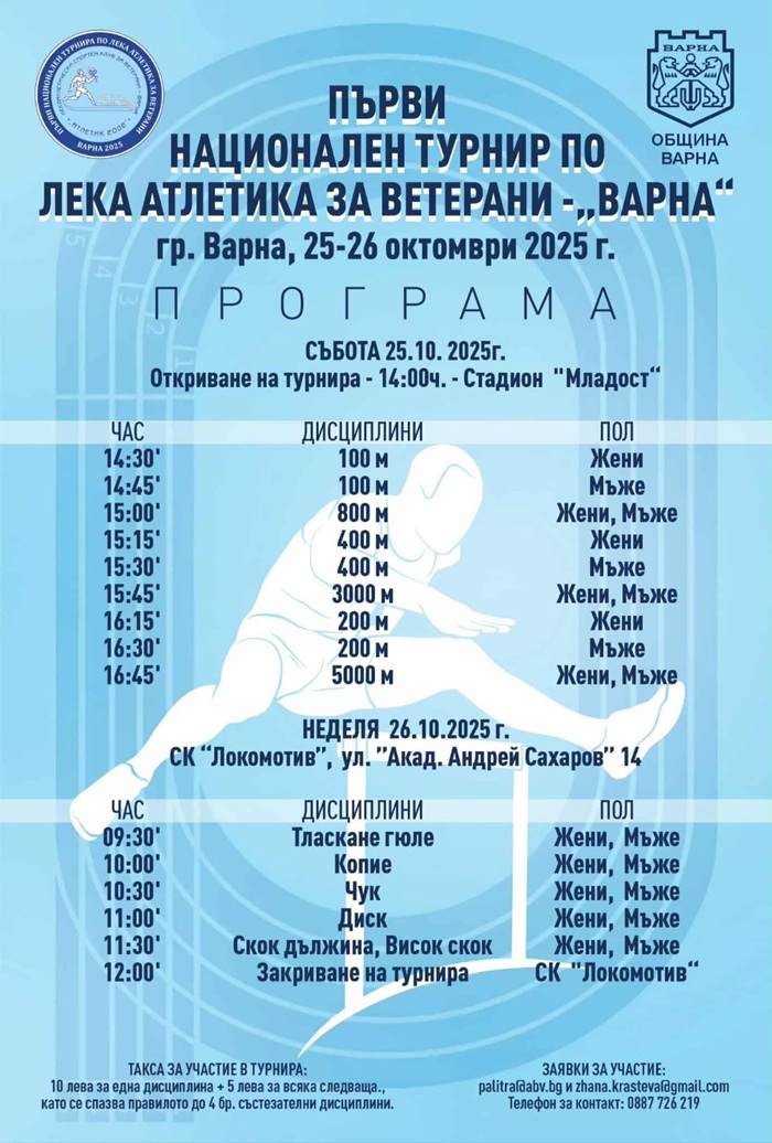 На 25 и 26 октомври морската ни столица ще бъде домакин на дебютното издание на Мастърс турнира по лека атлетика за ветерани „Варна“ – организиран от ЛСКВ „Атлетик 2002“ със съдействието на Дирекция „Спорт“ към Община Варна.
