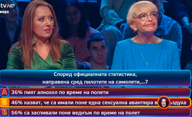 Милица и Камелия заложиха на авантюрата. Пъдев отбеляза като верен отговор пиенето, въпреки протестите на съотборника си Дънди. Според Пеев пилот никога не би си признал, че си сръбва по време на полет, така че е логично да заспива, тъй като в кабината винаги са по двама пилоти и няма нищо странно, ако единия от тях си почива и дори заспи.
