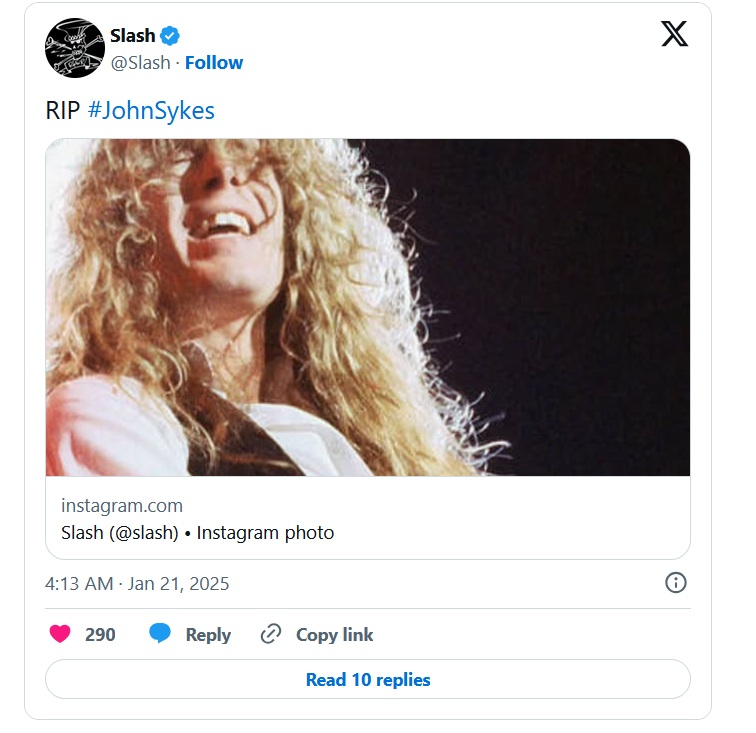 Китаристът на Guns N' Roses Слаш също сподели снимка на Сайкс и написа "RIP".