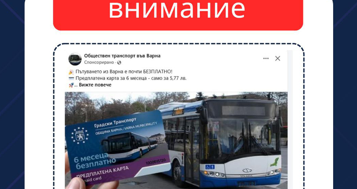 За поредна измама с карти за пътуване във Варна алармират от "Градски транспорт". Във фалшив профил на дружеството се предлага предплатена карта за 6 месеца на доста по-ниска цена - за 5,77 лв.