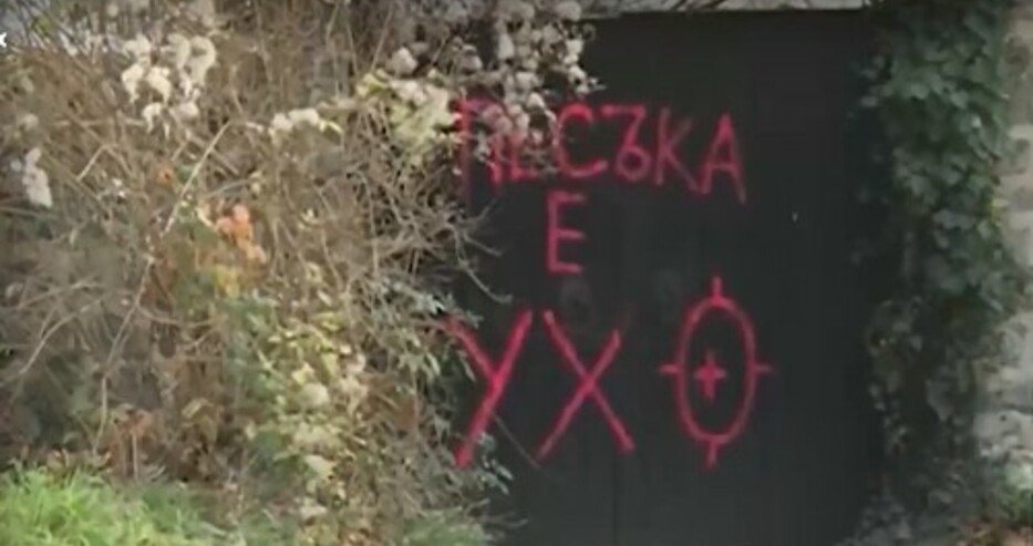 Мъжът слага дъски пред прозорците, за да не ги счупят. Така щетите остават само по фасадата и оградата. А върху портата има надписи с боя.