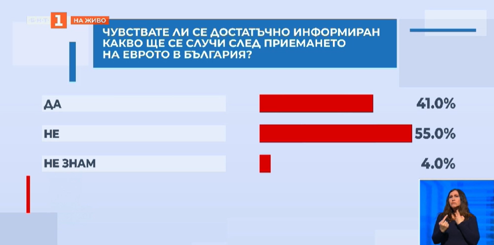 Петдесет и пет процента от българите заявяват, че не са достатъчно информирани какво ще се случи след приемането на еврото у нас. Четиридесет и един процента признават, че са информирани, а четири процента не знаят нищо по въпроса. Това са резултати от проучване на „Галъп“, които бяха последвани от ексклузивен коментар на Деница Сачева.
