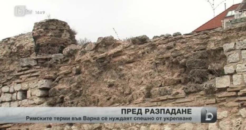 Камъни се сипят върху главите на туристите, които разглеждат Римските терми във Варна. Най-посещаваният архитектурен исторически обект се нуждае от спешно укрепване. Отпуснати са 150 хиляди лева, но те няма да стигнат за спасяването му, предаде Би Ти Ви. Обектът не е укрепван вече 3 години. Непрекъснато се руши, има и инциденти с туристи.