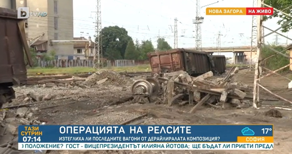 Приключи акцията по вдигане на дерайлиралите вагони край Нова Загора, където в петък стана инцидент с цели 10 такива. Три денонощия служители се опитваха да ги изтеглят с помощта на военна техника. Вчера и последните два вагона бяха вдиганти, а днес ще бъдат изтеглени, стана ясно от репортаж на БТВ.