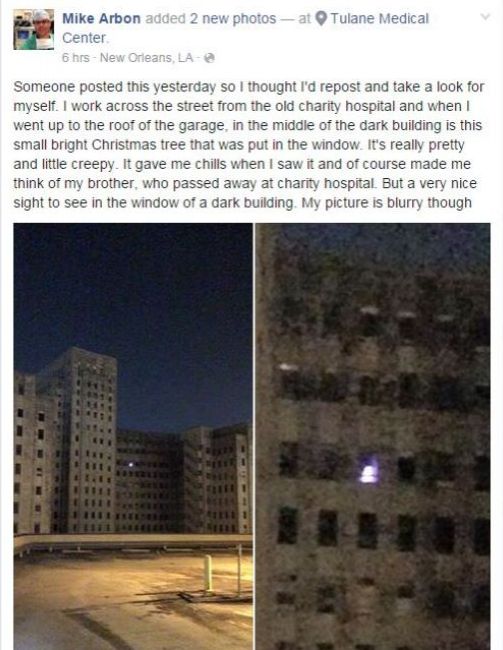 Изоставена от години болница в Ню Орлиънс стана сензация в медиите в САЩ. Светлинки подобни на коледна елха са били видени и снимани в един от тъмните прозорци, пише sfglobe.com.