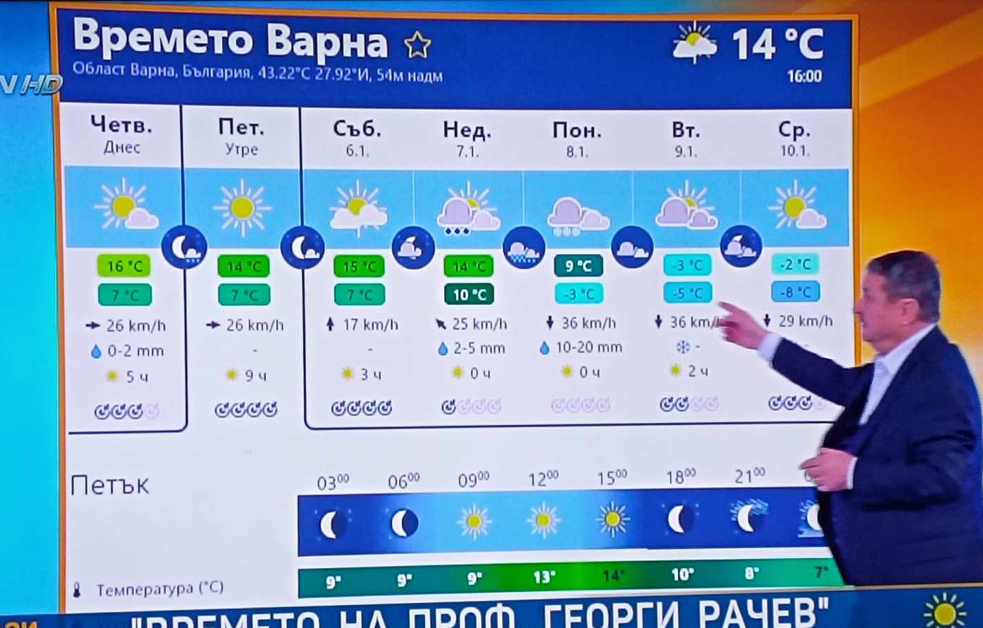 "Очаква ни зимно време от понеделник. От Ивановден в края и нататък. Навсякъде при земя е хладен, студен въздух, а във височина е топлия. И затова на Йордановден ще вали, ще вали, ще вали, ама дъжд. В планините ще се трупа сняг. И лека-полека с настъпването на Ивановден ще слиза в нулевата изотерма по-ниско, по-ниско, и вече в курортите и в ниските части ще има сняг. Това е сравнително трайна обстановка, тя ще продължи. А в периферията на този средиземноморски циклон ще нахлуе по-хладен въздух. И няма да стане страшно нещо, просто ще стане студено, типично за януари месец.