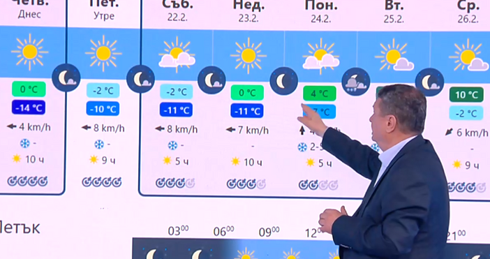 В понеделник и ворник затоплянето ще продължи и до началото на март температурите ще скачат плахо, но взривно. След 1 март те вече ще стигнат 10-12 градуса, а максималните минимални ще са 3-4.