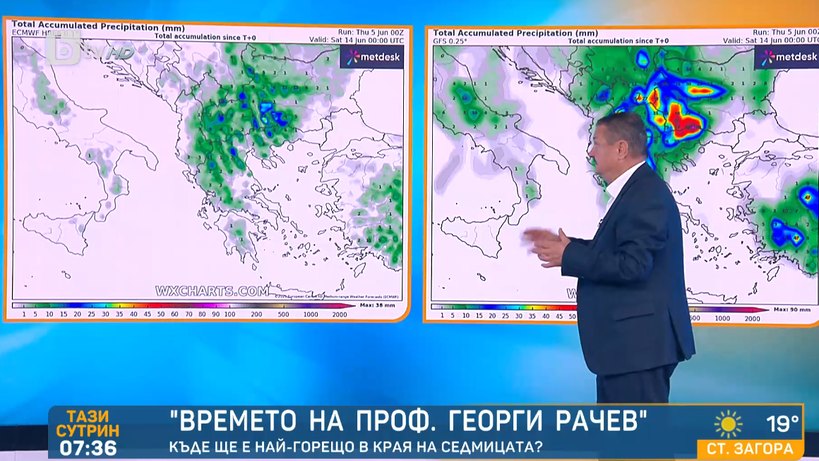 Според европейския модел до следващата събота акумулираните валежи ще са в Западна България 10 литра на квадратен метър и в планините до 15 литра, което е нищо работа. Американският модел е по-дашен, но отново говорим за малко валежи в Западна България. Валежите избягаха, някъде 20, 30 литра ще бъдат, колкото е площада на едно село. Утре е Черешова задушница и има понятие черешови води, което е следствие на поройни валежи, характерни за този перид, затова се надявам да завали, каза още по бТВ Рачев.