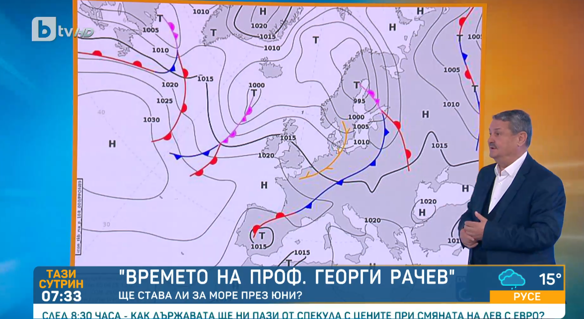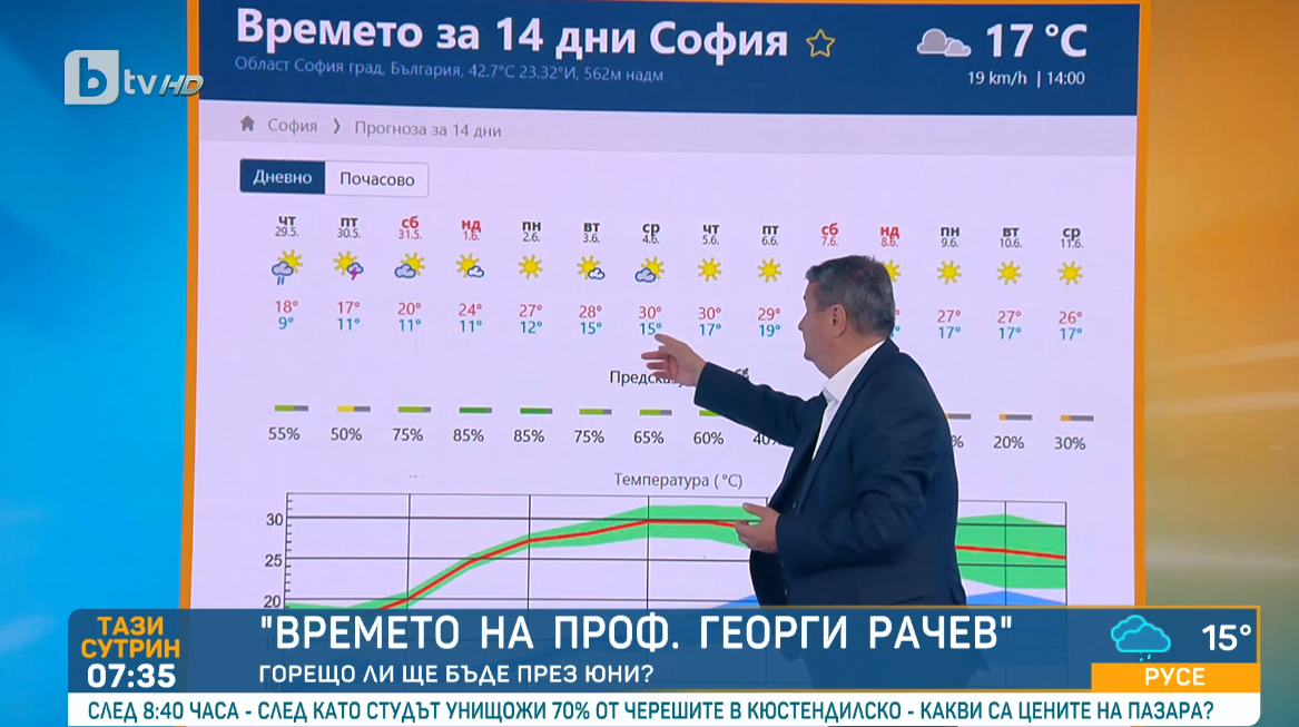 От четвъртък от неделя ще заприличаме на Гърция – слънце, слънце и слънце. През тези дни ще имаме 14-15 часа слънчево време. Като изгрее слънцето, както казват сладурите, ще грее и ще ги гледа цял ден. Температурите ще са изключително високи и вече няма да ги има тези 11, 12, 13 градуса минимални температури. Това ще е типично лято със средни денонощни температури над 15 градуса, каза още по бТВ проф. Георги Рачев.