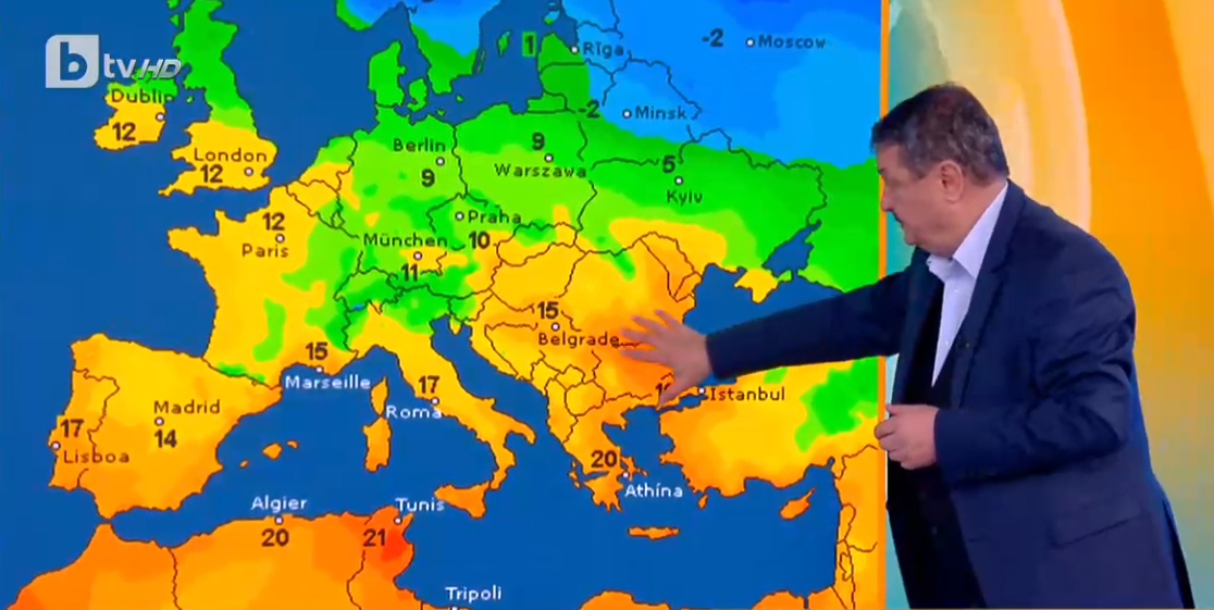 На шести, точно вторникът, ето, погледенете го това вече оранжево петно над Балканите, по-топло от Мадрид, където отбелязаха почти 30 градуса преди няколко дни. По целите балкани и в България нищо чудно да има температури от 20 градуса, добави той.