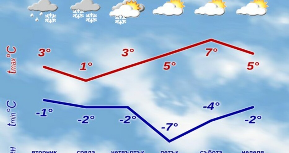 След обяд ще отслабнат, в по-голямата част от страната и ще спрат. Минималните температури ще са между минус 5° и 0°, а максималните - между минус 1° и 4°. В четвъртък ще е ветровито, с променлива, по-често значителна облачност, но само на отделни места, главно в планинските райони ще превали слаб сняг.