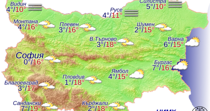 През нощта ще бъде ясно и тихо. Сутринта на много места в низините, котловините и около водните басейни ще има мъгла или ниска слоеста облачност. През деня ще бъде предимно слънчево, но в долното поречие на Тунджа и Марица до около обяд, а в Дунавската равнина почти през целия ден ще се задържи мъгливо. Ще остане тихо. Минималните температури ще са между 1° и 6°, малко по-ниски в котловините от Югозападна България, а максималните ще са между 13° и 18°, по-ниски в местата с трайна мъгла. В София минималната температура ще е около 0°, максимална - около 16°.