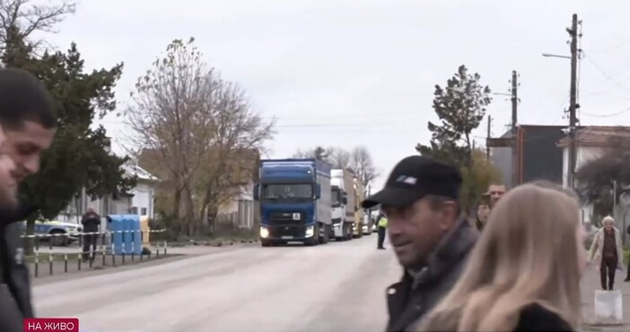 Демонстрацията протича мирно, но жителите на селото решиха да блокират пътя като преминават по пешеходната пътека. За минути се натрупа огромна опашка от камиони.