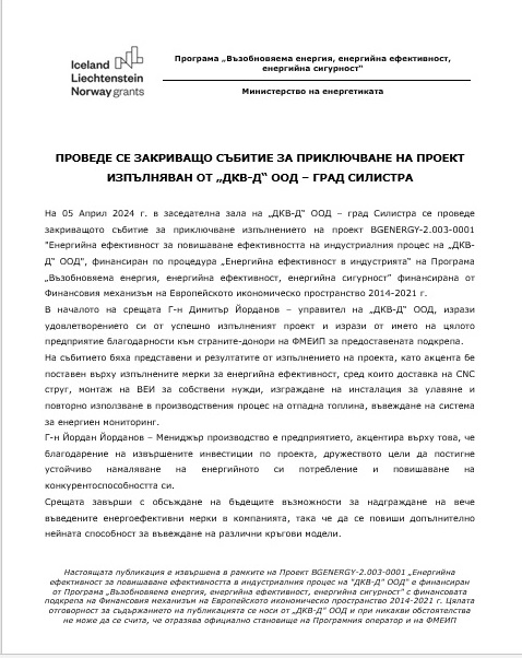 На 05 Април 2024 г. в заседателна зала на „ДКВ-Д“ ООД – град Силистра се проведе закриващото събитие за приключване изпълнението на проект BGENERGY-2.003-0001 "Енергийна ефективност за повишаване ефективността на индустриалния процес на „ДКВ-Д“ ООД", финансиран по процедура „Енергийна ефективност в индустрията“ на Програма „Възобновяема енергия, енергийна ефективност, енергийна сигурност” финансирана от Финансовия механизъм на Европейското икономическо пространство 2014-2021 г.