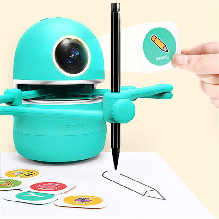 Quincy, роботът художник! Бъдете сигурни, досега децата ви не са срещали толкова забавен учител. Работата му не е просто да научи вашите малчугани да оцветяват и да рисуват всякакви неща, но и да превърне всеки урок в тотален купон. Работи със специални карти, които след като вие, родители, сканирате, ще представя под формата на инструкции и стъпка по стъпка покажа на децата ви как да нарисуват първите си съвършени артистични произведения на изкуството.