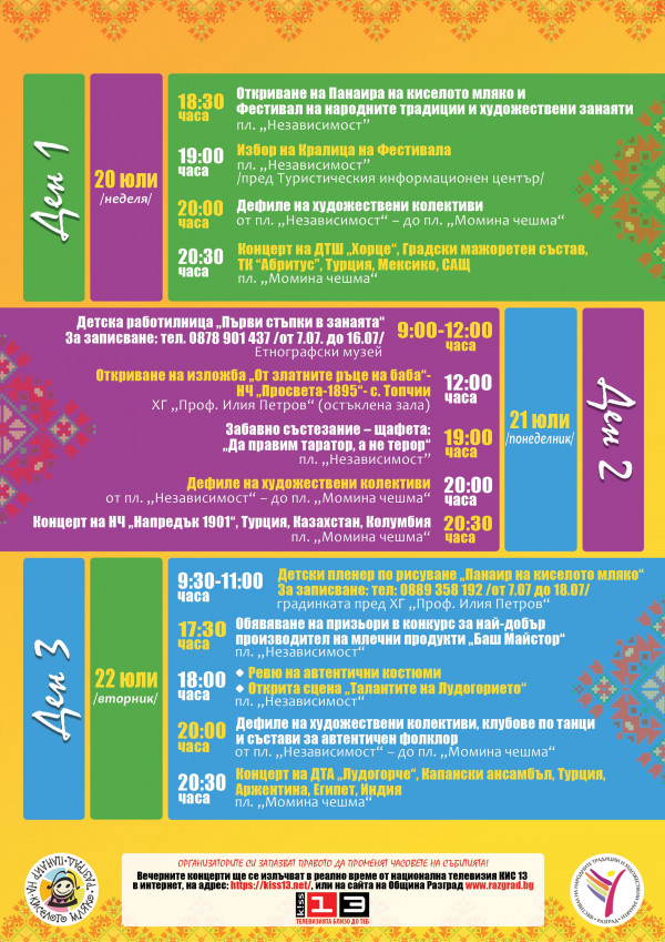 Всички вечерни концерти ще бъдат излъчвани на живо от телевизия КИС 13: www.kiss13.net и сайта на Община Разград: www.razgrad.bg