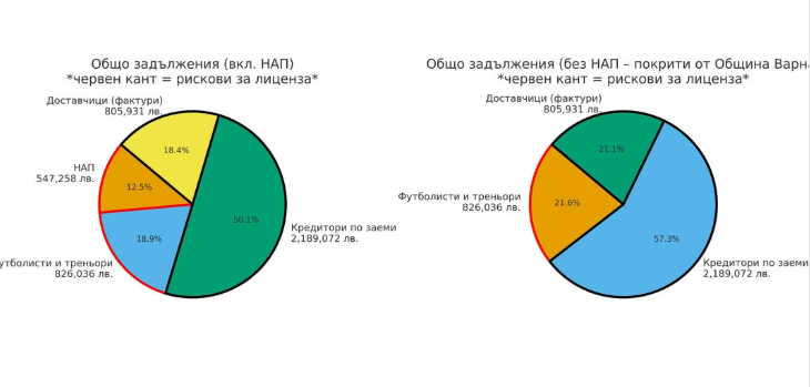 Тъй като много хора ме питат (не знам защо мен), дали днешното решение на Общински съвет Варна решава проблемите на Спартак с лиценза, публикувам една графика, от която е видно какви са задълженията на клуба и коя част от тях са свързани с лиценза ни.
