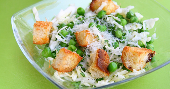 • За рецептата "Зелева салата с грах и крутони” хлябът Чаабата се нарязва на кубчета.