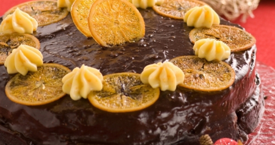 Сложете 1 блат в поднос, намажете го обилно с 2/3 от портокалов крем, сложете втория блат, намажете 1/3 портокалов крем и залейте с шоколадовия крем. Направете украса от карамелизираните портокали.