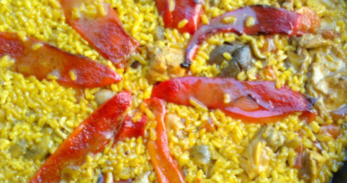 Разбърквате леко, за да се разпредели равномерно. До напълното приготвяне на паелята не се разбърква повече. Когато оризът набъбне леко, нареждате чушката отгоре.