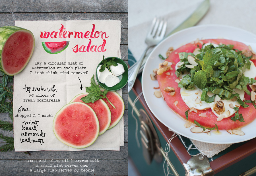 Разрежете динята на кръгове с дебелина около 4-5 см. Изрежете кората с остър нож. Поставете резена в салатна чиния. Наредете няколко парчета моцарела отгоре й. Например една топка на 10 филийки и разделени по 5 на парче. Измивате и нарязвате ментата и босилека, като съотношението им е 2:1. Поръсвате върху моцарелата, а след това и с натрошените ядки. Малко сол и зехтин накрая и готово.