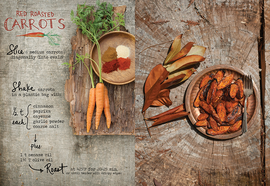 Почистете и нарежете морковите на големи и плътни ленти. Към тях добавете подправките и разбъркайте добре, като за салата. Прибавете олиото и зехтина, и пъхнете в нагорещена фурна на силен огън за около 20 минути.
