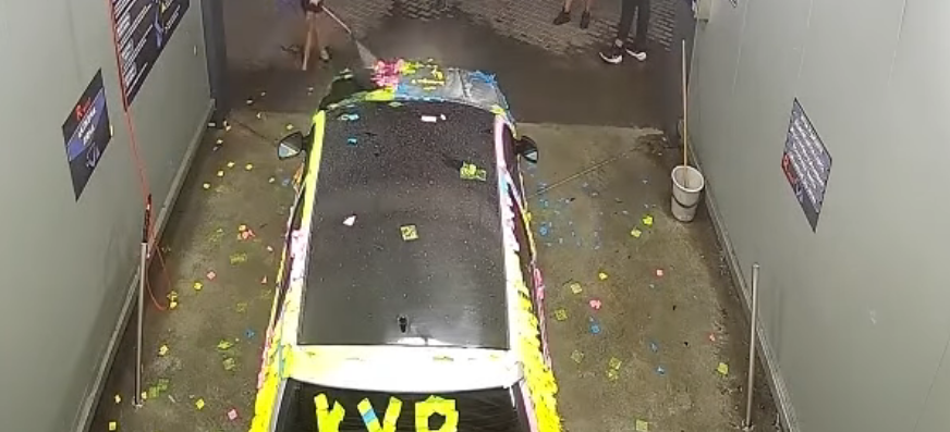 От клип в коментарите обаче се вижда клип от автомивката, от който става ясно, че на задното стъкло има и нецензурен надпис.