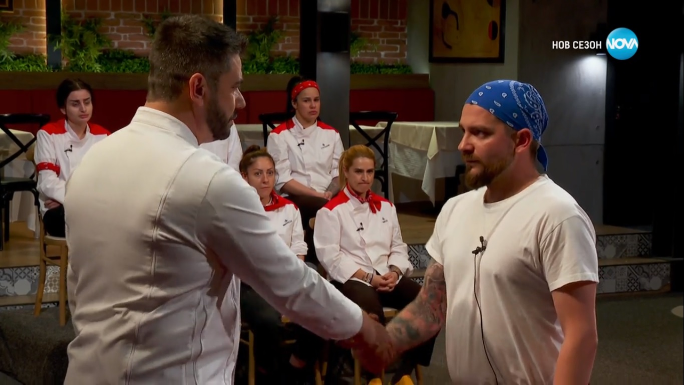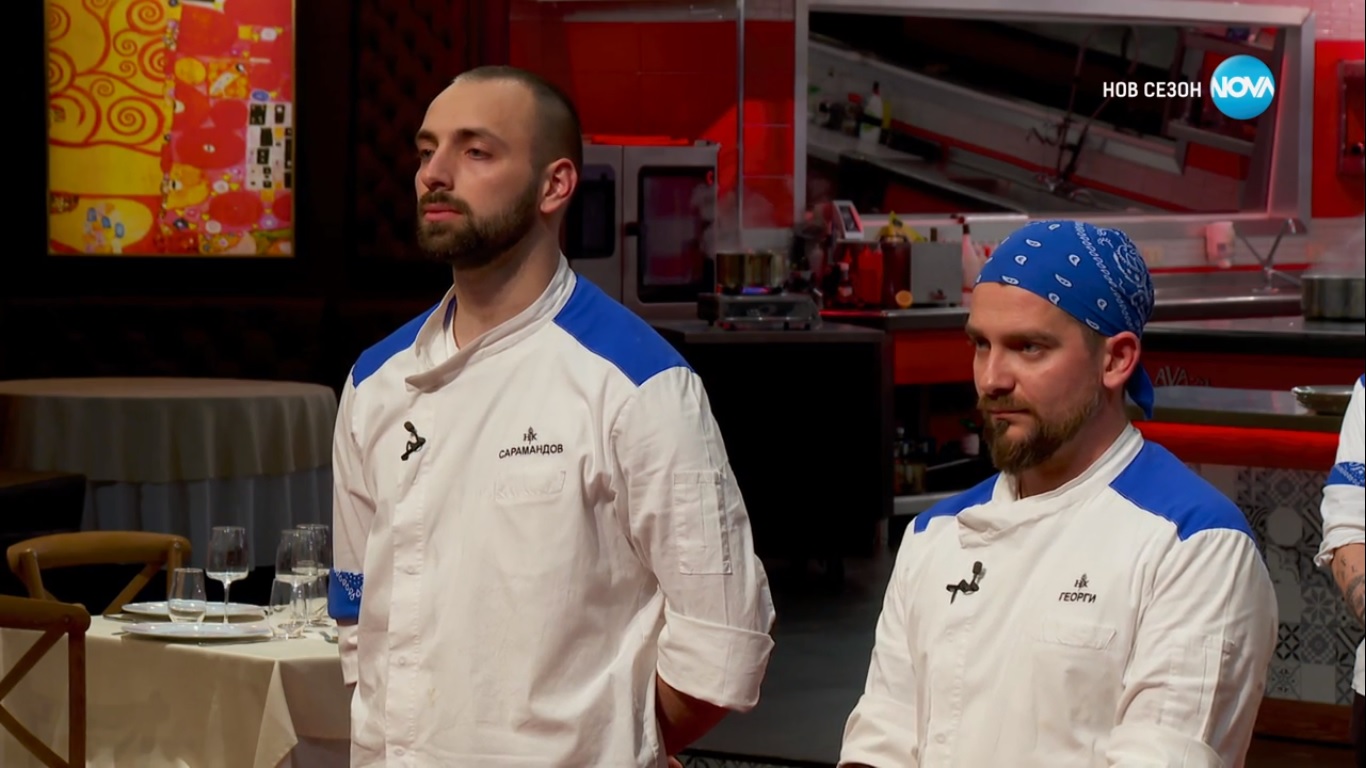 Тази вечер шеф Виктор Ангелов посочи вратата на още един участник. Става дума за 32-годишния Георги от Варна, който бе номиниран за гонене заедно със Сарамандов от синия отбор. Мъжете не се справиха с тазвечершната резервация, а с най-голяма вина за това бяха именно те двамата.