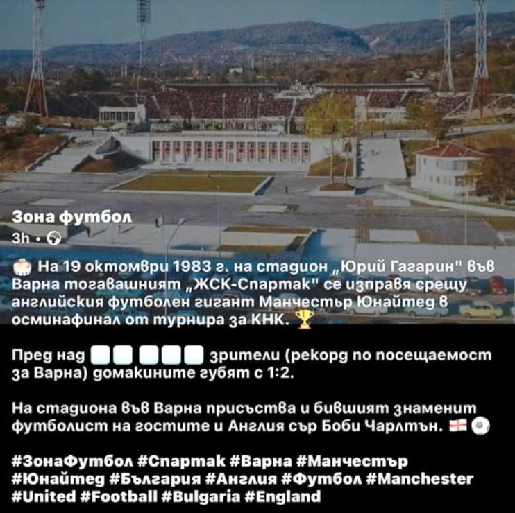 Шефът на Спартак отбеляза с прелюбопитен пост годишнината от историческия мач на "соколите" с Манчестър Юнайтед във Варна. Преди 42 години - на 19 октомври 1983-та, Спартак губи от "червените дяволи" с 1:2 пред рекордните над 40 000 зрители на стадион "Юрий Гагарин". Впоследствие варненци отстъпват и с 0:2 в реванша от 1/8-финалите в КНК и напускат надпреварата, но и досега си остават единствения български клуб, който е играл официални срещи с европейския гранд.
