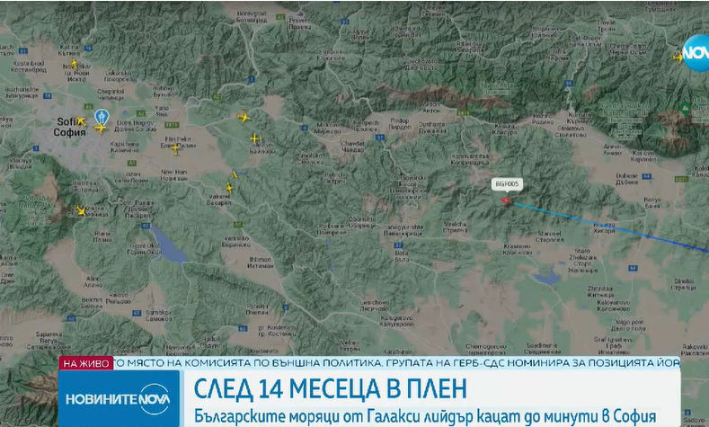Правителственият самолет с българските моряци капитан Любомир Чанев и помощник-капитан Данаил Веселинов вече лети над България. В момента той е в небето над Панагюрище. Очаква се в 16:22 часа или минути по-късно той да кацне на летище София.